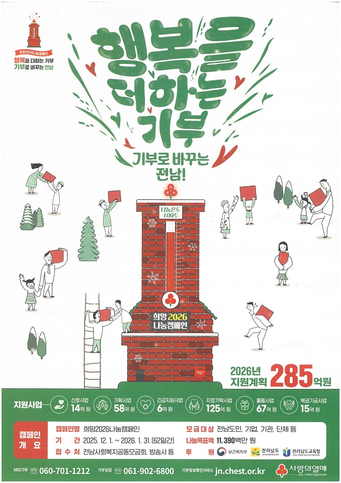 순천시(시장 노관규)는 전남사회복지공동모금회와 함께 오는 12월 1일부터 2026년 1월 31일까지 62일간 ‘희망2026나눔캠페인’을 실시한다고 밝혔다.