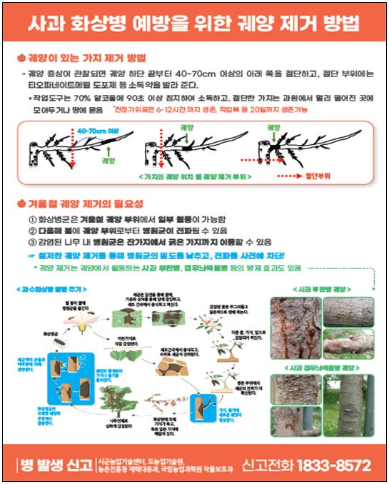 또한 과원 주변에 자라는 산사나무, 모과나무, 살구나무, 비파나무, 꽃사과 등 기주식물도 주기적으로 살펴 궤양 증상이 있는 가지·줄기를 즉시 제거하고, 잘라낸 가지는 과원에 방치하지 말고 매몰 또는 소각 처리해야 한다.