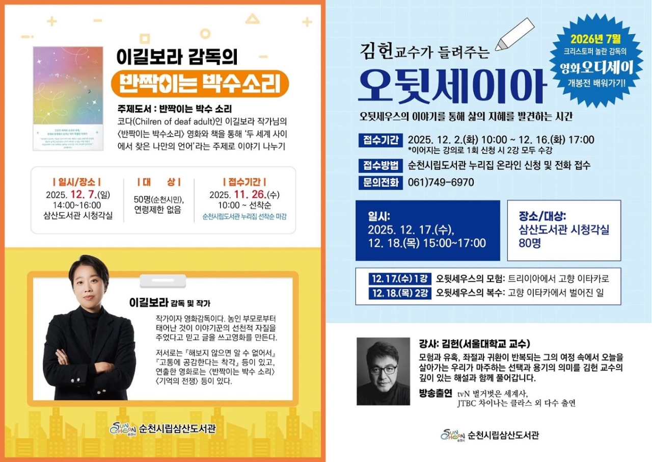 이번 강연은 순천시립도서관 누리집을 통해 사전 신청할 수 있으며, 자세한 문의는 삼산도서관(061-749-6970)으로 하면 된다.