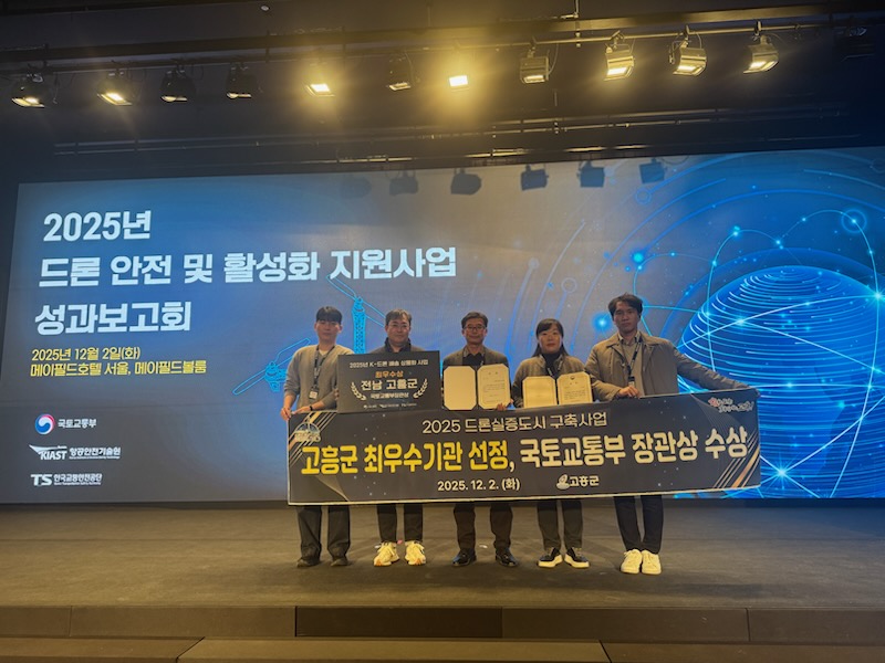 고흥군(군수 공영민)은 2일 메이필드호텔 서울에서 열린 ‘2025년 드론 안전 및 활성화 지원 성과보고회’에서 드론실증도시 구축사업 최우수 지자체로 선정돼 국토교통부 장관상을 수상했다고 밝혔다.