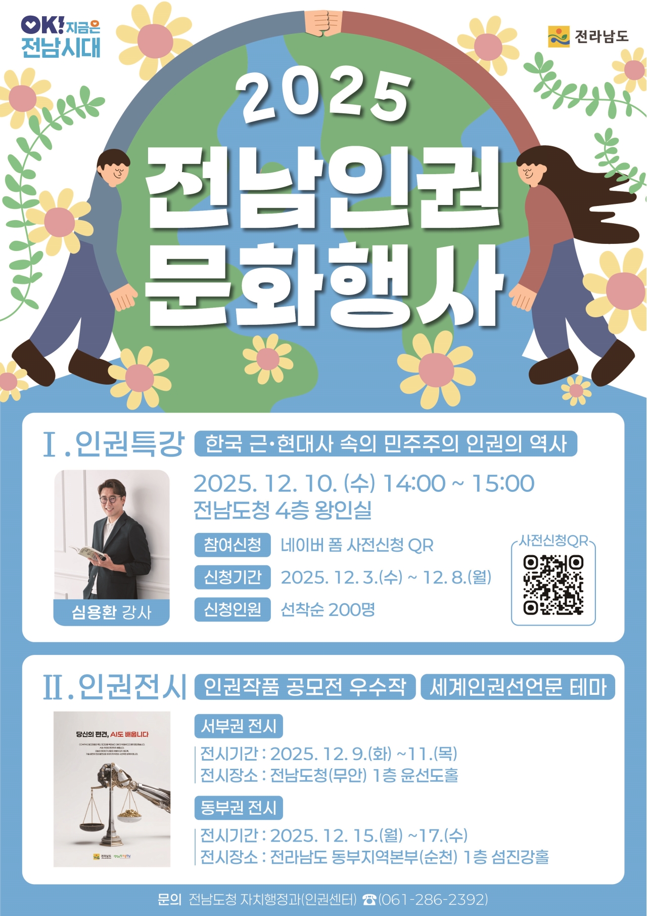 전라남도가 세계인권선언 77주년을 맞아 인권 문화 확산을 위해 오는 9일부터 17일까지 인권 특강, 인권공모전 우수작 전시회 등 ‘2025 도민인권증진 문화행사’를 연다.