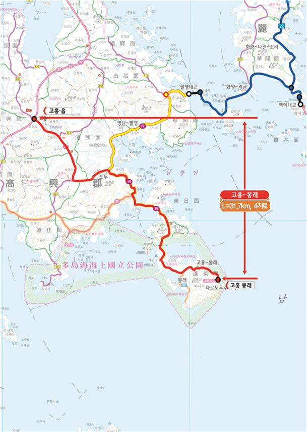 특히 ‘국도 15호선 고흥~봉래 4차로 확장공사’는 총길이 31.7㎞ 구간을 기존 2차로에서 4차로로 확장하는 사업으로, 총사업비 6,521억 원이 투입된다. 올해 1월 신속예타 선정 후 약 7개월간의 노력 끝에 8월 예비타당성 통과라는 결과를 이뤄냈었다.