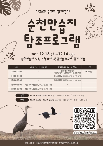 순천시 순천시는 오는 13일부터 14일까지 순천만습지 일원에서 ‘제26회 순천만 갈대축제_겨울철새 탐조 특별...
