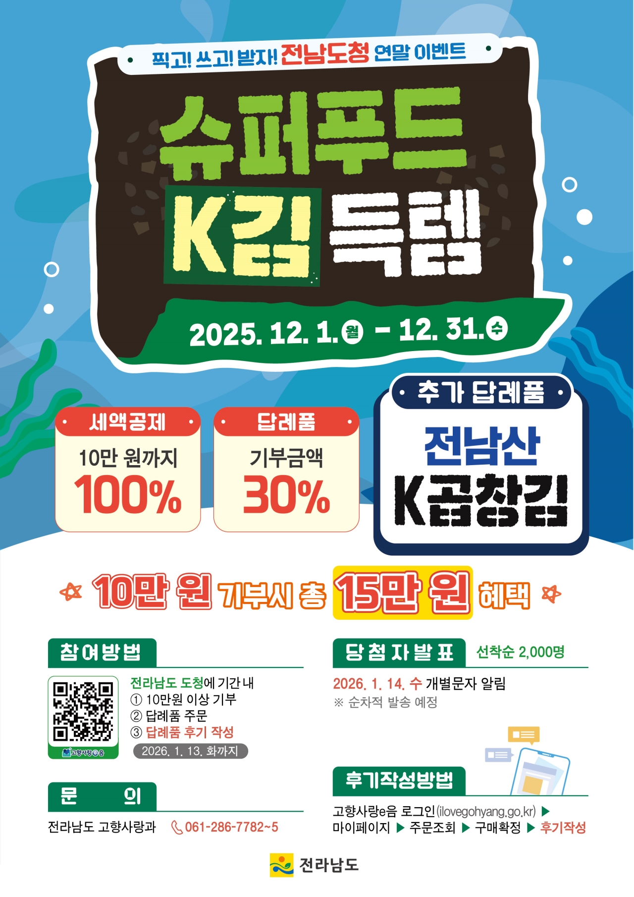 전라남도가 연말을 맞아 고향사랑기부제 참여 확대와 지역 수산물 소비 촉진을 위해 슈퍼푸드 케이(K)김을 활용한 대규모 연말 이벤트를 진행한다.