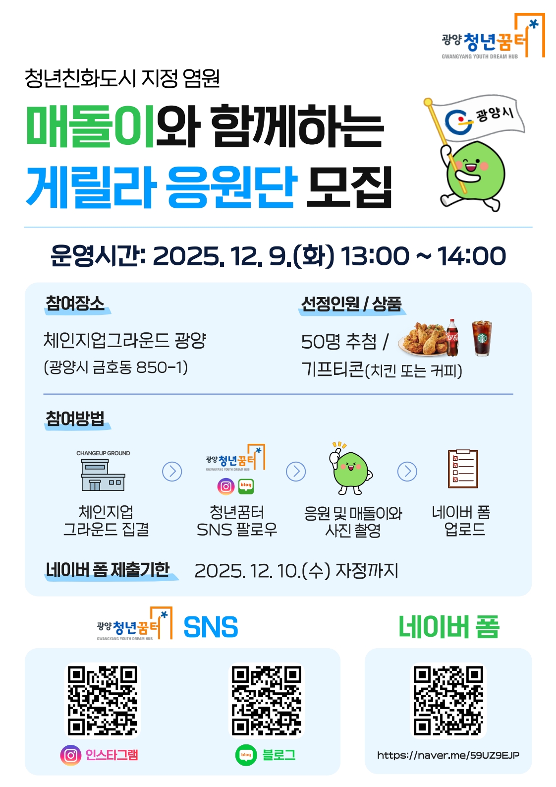 참여를 희망하는 시민은 행사 당일 체인지업그라운드 광양에서 게릴라 응원에 참여한 후 매돌이와 인증사진을 촬영하면 된다. 이후 청년꿈터 공식 SNS 계정을 팔로우하고 인증사진을 12월 10일까지 네이버 폼에 업로드하면 참여가 완료된다. 모든 절차를 완료한 참여자 중 총 50명을 추첨해 치킨 또는 커피 기프티콘을 제공할 예정이다.