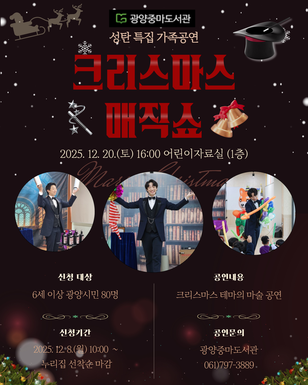 김현숙 도서관과장은 “아이들이 이번 공연을 통해 새로운 상상과 창의의 세계를 경험하고 마술의 원리를 탐구하는 재미를 느끼길 기대한다”며 “도서관을 찾은 가족 모두가 함께 웃고 공감하며 따뜻한 성탄의 추억을 만들어 가길 바란다”고 말했다.