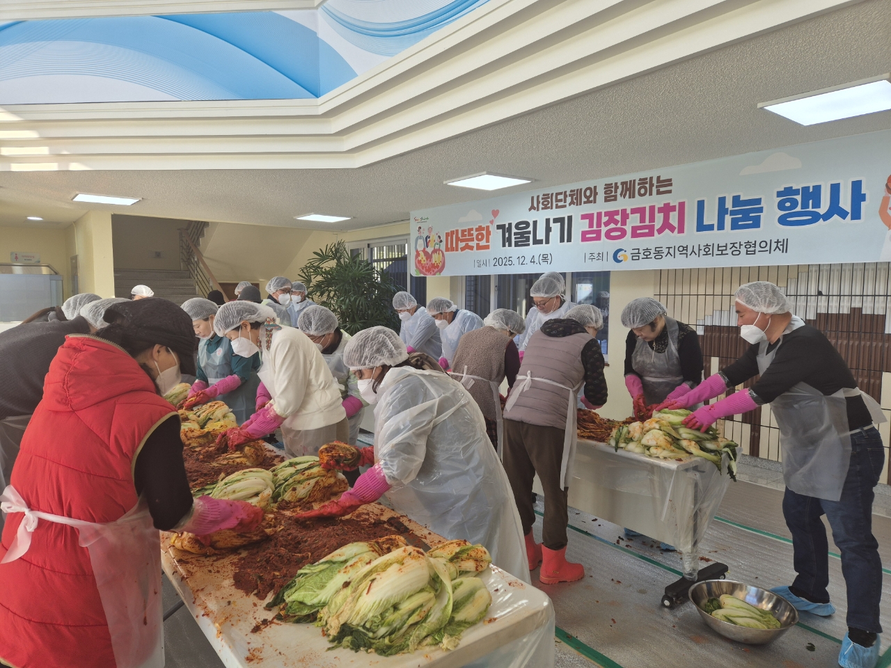이번 행사는 금호동지역사회보장협의체(공공위원장 서은희, 민간위원장 박복희) 주관으로 진행됐으며, 관내 사회단체장과 자원봉사자 40여 명이 참여했다. 참여자들은 갑작스러운 추위 속에서도 이틀 동안 정성스럽게 재료를 손질하고 양념을 준비해 김장김치 300포기를 직접 담갔다.