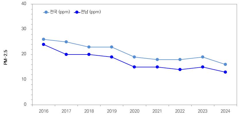 2024년 전남지역 미세먼지와 초미세먼지 농도가 최근 10년 중 가장 낮고, 특히 초미세먼지는 전국에서 가장 낮은 수준이었던 것으로 나타났다.