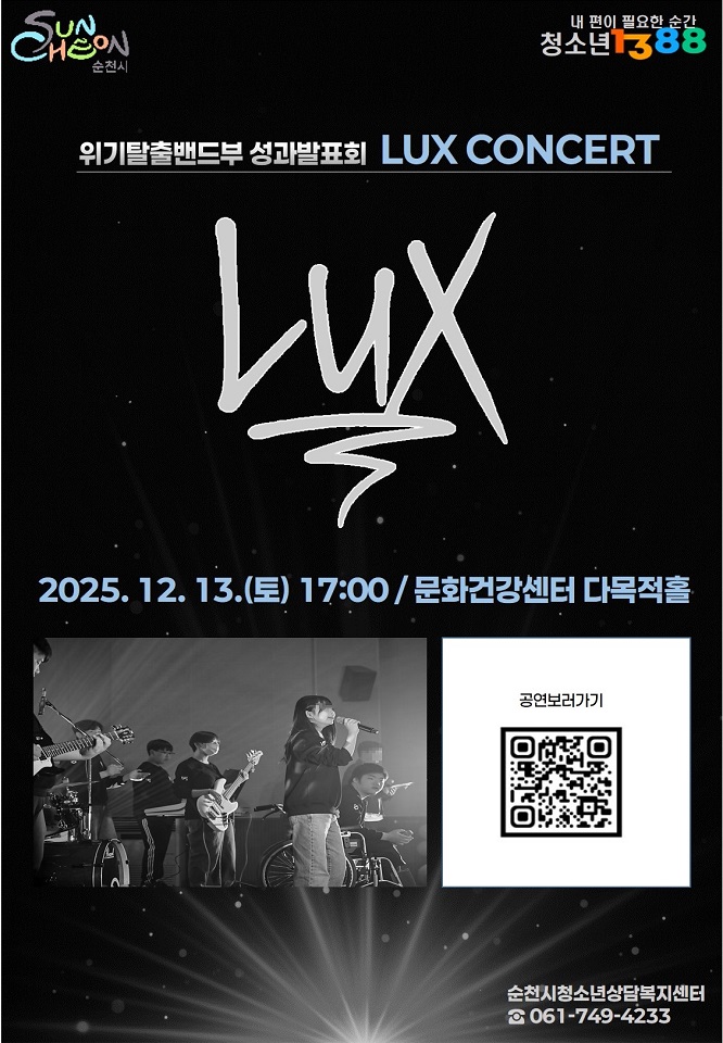 순천시 청소년상담복지센터는 오는 13일 문화건강센터 다목적홀에서 청소년 밴드 ‘LUX(빛)’ 연말 콘서트를 개최한다.
