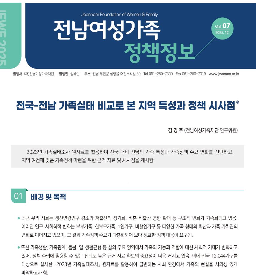 ❏ 전남여성가족재단은 12월 11일(목) 「전국-전남 가족실태 비교로 본 지역 특성과 정책 시사점」을 주제로 전남여성가족 정책정보 7호를 발간했다. 이번 호에서는 <전국 가족실태조사> 통계를 기반으로 전국과 전남의 가족형성, 가족관계, 돌봄, 일·생활균형 등 가족실태를 비교·분석하여 전남의 특성과 정책적 함의를 도출하였다.