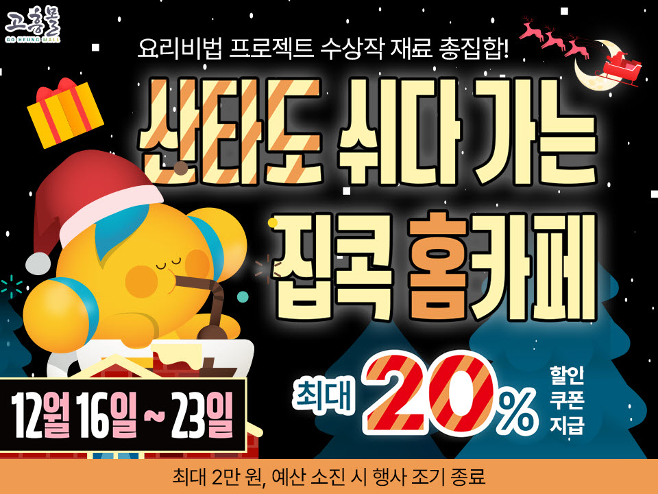 고흥군(군수 공영민)이 운영하는 온라인 농수축특산물 쇼핑몰 ‘고흥몰’이 12월 16일부터 23일까지 겨울 홈카페 콘셉트의 특별 기획전 ‘산타도 쉬다 가는 집콕 홈카페’을 개최한다고 밝혔다.
