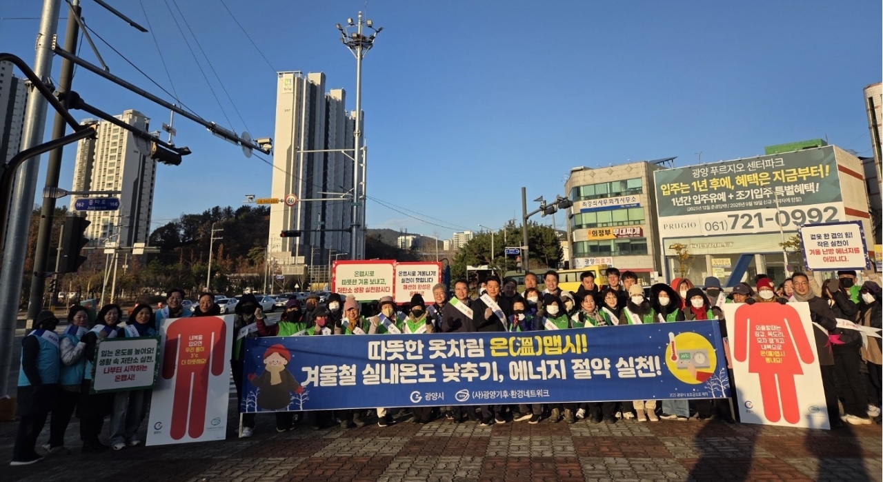 광양시와 (사)전남광양기후·환경네트워크는 가정과 사업장의 겨울철 에너지 절약 실천 분위기를 조성하고 온실가스 감축에 대한 시민들의 자발적인 참여를 유도하기 위해 지난 12일 중동 컨테이너부두 사거리에서 탄소중립 생활실천 ‘온(溫)맵시’ 홍보 캠페인을 실시했다.