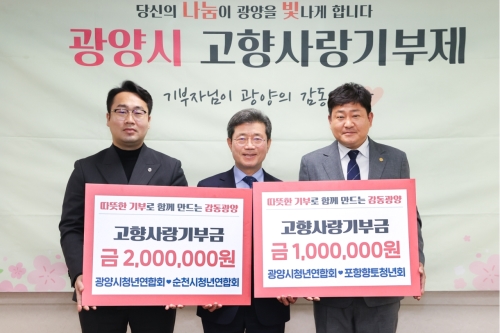 광양시 광양시는 15일 시청 만남실에서 광양시청년연합회(회장 안타국) 회원 일동의 고향사랑기부금 전달식이 열...
