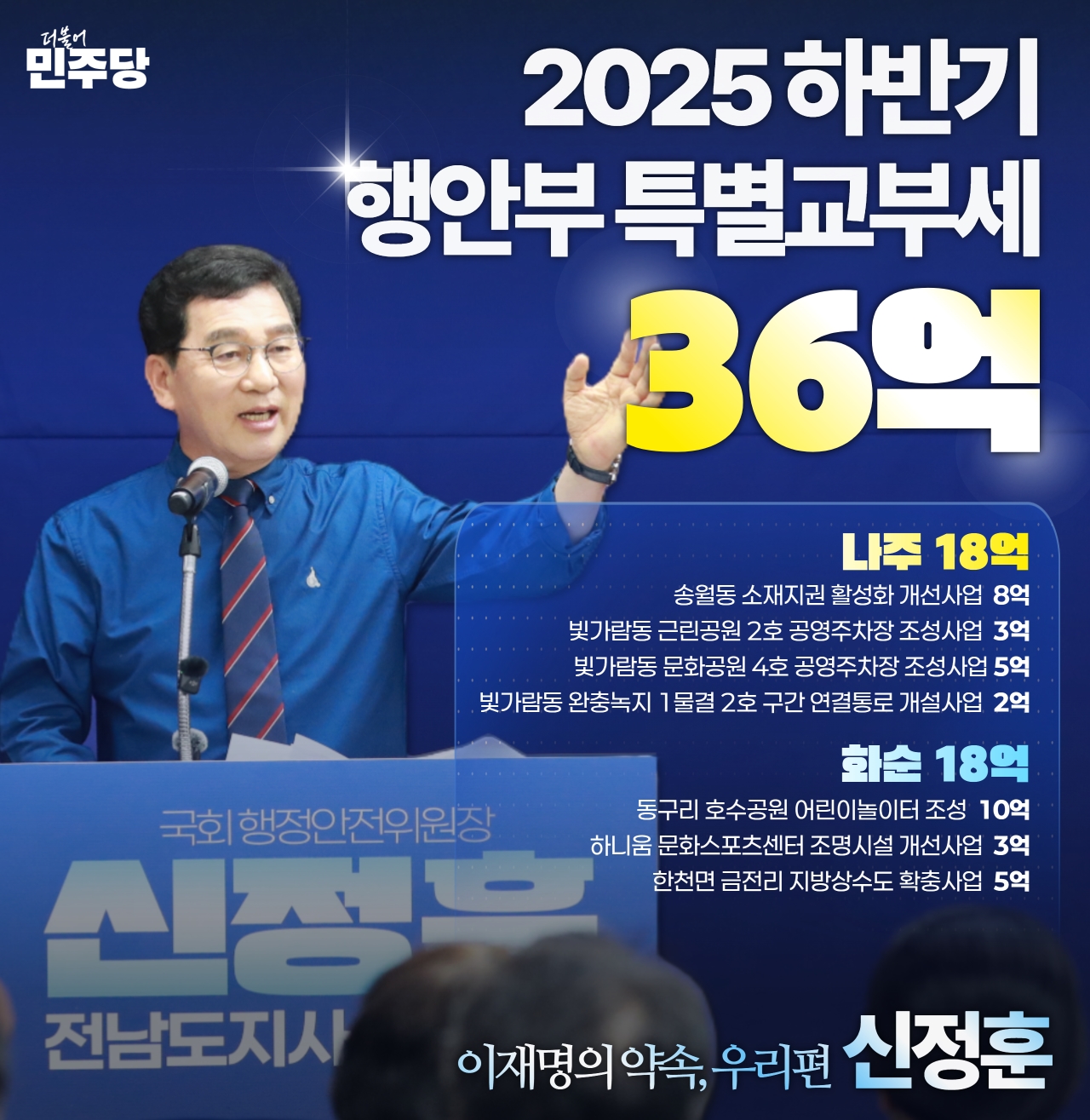 ❍ 한편 신정훈 의원은 22대 국회 들어 현재까지 행정안전부 특별교부세 총 175억원을 확보하며, 나주·화순 지역의 생활 SOC 확충과 주민 불편 해소를 위한 주요 현안 사업들을 꾸준히 챙기고 있다.