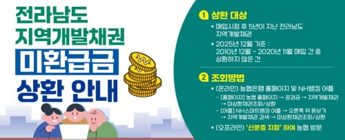 전라남도 전라남도가 오는 31일까지 보름여간 2025년 전남도 지역개발채권 미환급금 일제상환 기간을 운영, ...