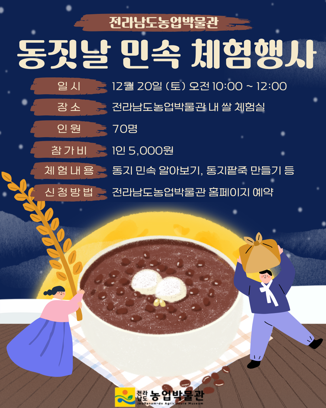행사는 동짓날의 절기적 의미와 전통 민속을 소개하고, 동지팥죽을 만들어 보는 체험 중심 프로그램으로 구성됐다. 선착순 70명이며, 참가 신청은 전남도농업박물관 누리집(http://www.jam.go.kr)에 하면 된다. 참가비는 무료다.