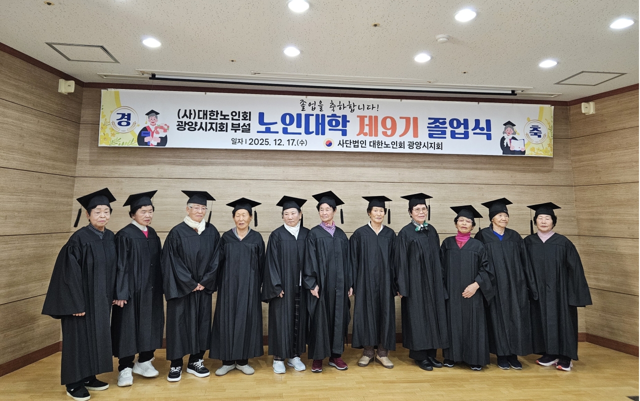 (사)대한노인회 광양시지회(지회장 김종규)는 지난 17일, 광양시지회 회의실에서 부설 노인대학 제9기 졸업식을 개최하고, 교육과정을 성실히 이수한 어르신 12명에게 졸업장을 수여했다.