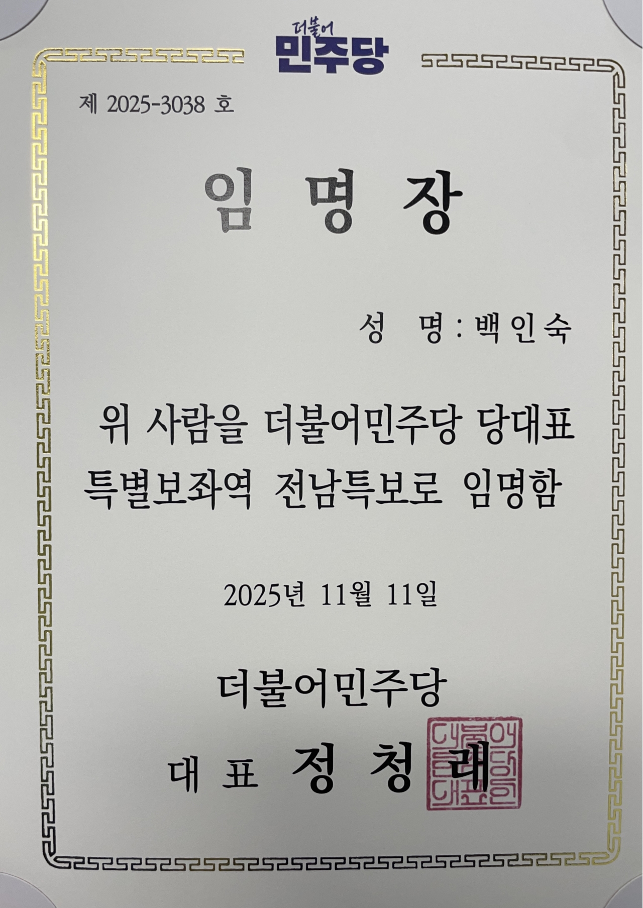 백인숙 여수시의회 의장이 더불어민주당 정청래 당대표 특보로 공식 임명됐다.