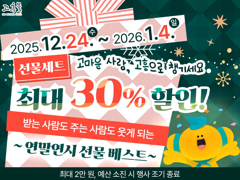 고흥군(군수 공영민)이 운영하는 온라인 농수축특산물 쇼핑몰 ‘고흥몰’이 연말연시를 맞아 2026년 1월 4일까지 ‘고마운 사람, 고흥으로 챙기세요 – 연말연시 선물 베스트’ 기획전을 진행한다.