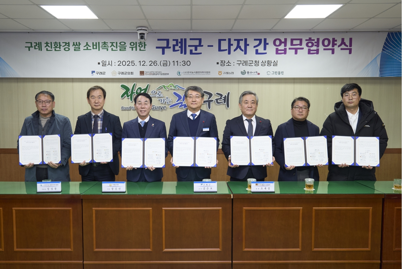 구례군은 친환경 농업의 가치를 확산하고 쌀 소비 기반을 강화하기 위해 공공·금융·농협·민간이 참여하는 다자간 업무협약을 지난 12월 26일 군청 상황실에서 체결했다.