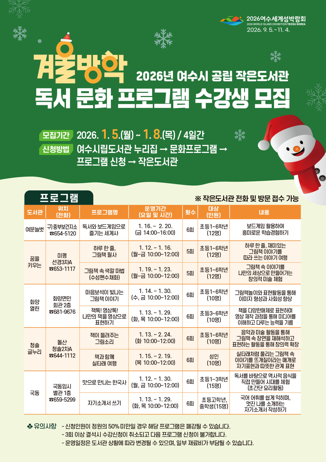 여수시가 운영하는 5개 공립 작은도서관에서 오는 2026년 1월 5일부터 8일까지 ‘겨울방학 독서문화 프로그램’ 수강생 106명을 선착순 모집한다.