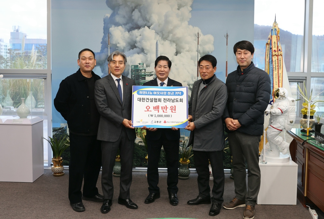 공영민 군수는 “지역사회와 상생하며 어려운 이웃을 위해 따뜻한 나눔을 실천해 주신 대한건설협회 전라남도회에 깊이 감사드린다”며 “기탁된 성금은 도움이 절실한 이웃들에게 투명하고 소중하게 전달하겠다”고 말했다.
