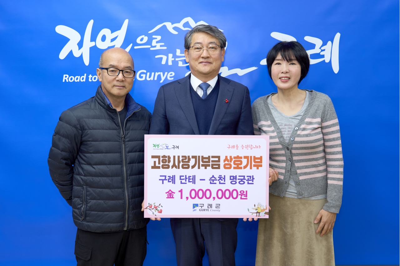 이번 상호 기부는 구례군 산동면 소재 외식업체인 단테의 노현정 대표와 순천시 명궁관의 박수영 대표가 지역발전을 위한 응원을 공감하며 이루어 졌으며, 각 100만원씩을 상호 기탁하였다.