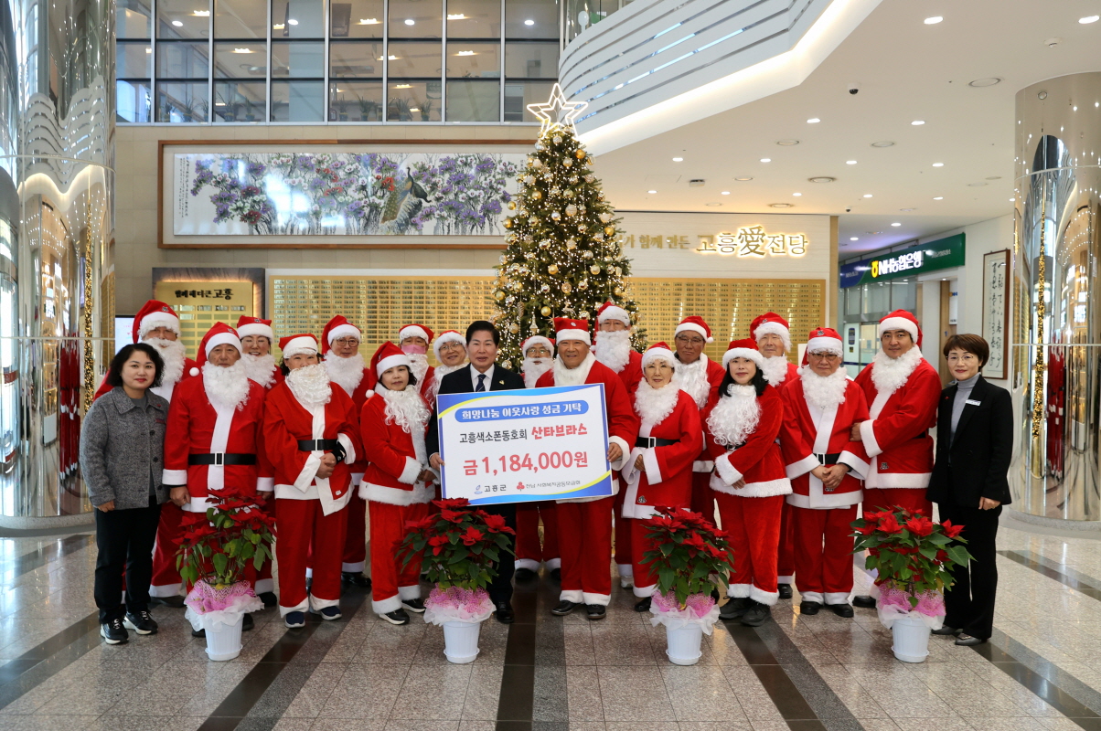 고흥군(군수 공영민)은 31일 고흥평생교육관 색소폰동호회 ‘산타브라스’(회장 이봉남)가 연말을 맞아 재능기부 활동으로 마련한 성금 118만 4천 원 지역 소외계층을 위해 사용해 달라며 기탁했다고 밝혔다.