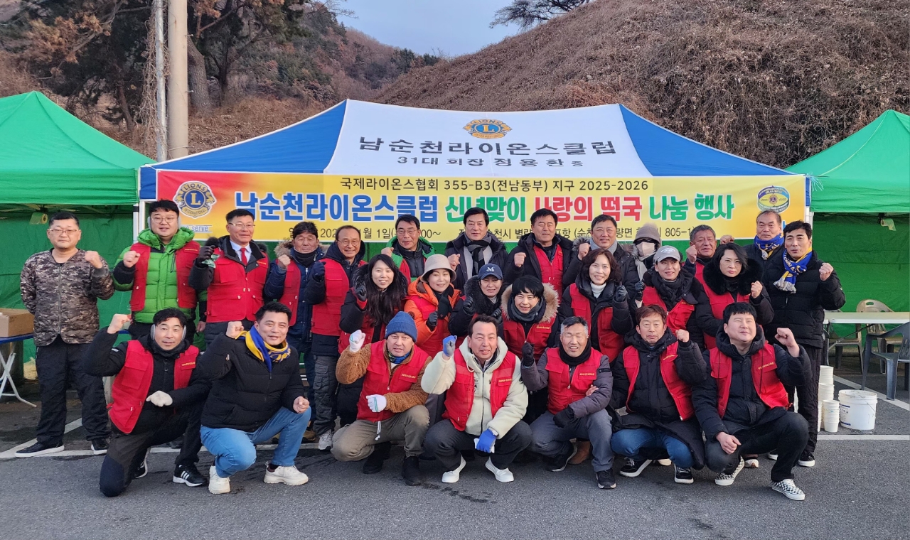 남순천라이온스클럽은 2026년 병오년 새해 첫날 해돋이 명소로 알려진 별량면 화포해변(화포항) 일대에서 관광객 3,000여 명에게 사랑의 떡국 나눔 행사를 성황리에 마무리했다고 2일 밝혔다.