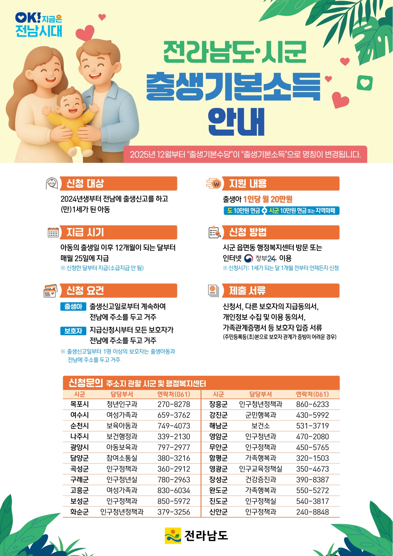 전라남도는 2024년생에 이어 전남에서 태어난 2025년생 출생아에게 전라남도–시군 출생기본소득을 지급한다.