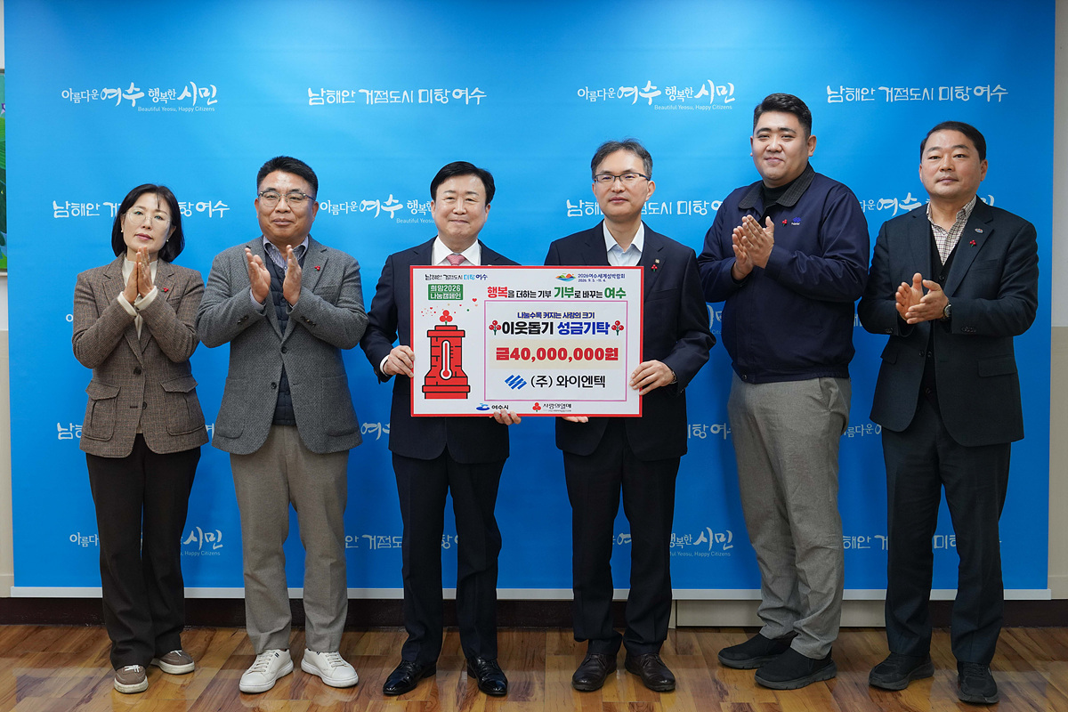 여수시는 지난 6일 ㈜와이엔텍(대표이사 박지영)이 저소득 취약계층 지원을 위해 성금 4천만 원을 희망2026나눔캠페인 성금으로 기탁했다고 밝혔다.