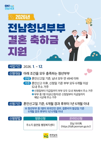 전라남도 전라남도는 청년부부의 결혼 초기 경제적 부담 완화와 전남 지역 정착 유도를 위해 ‘청년부부 결혼축하...
