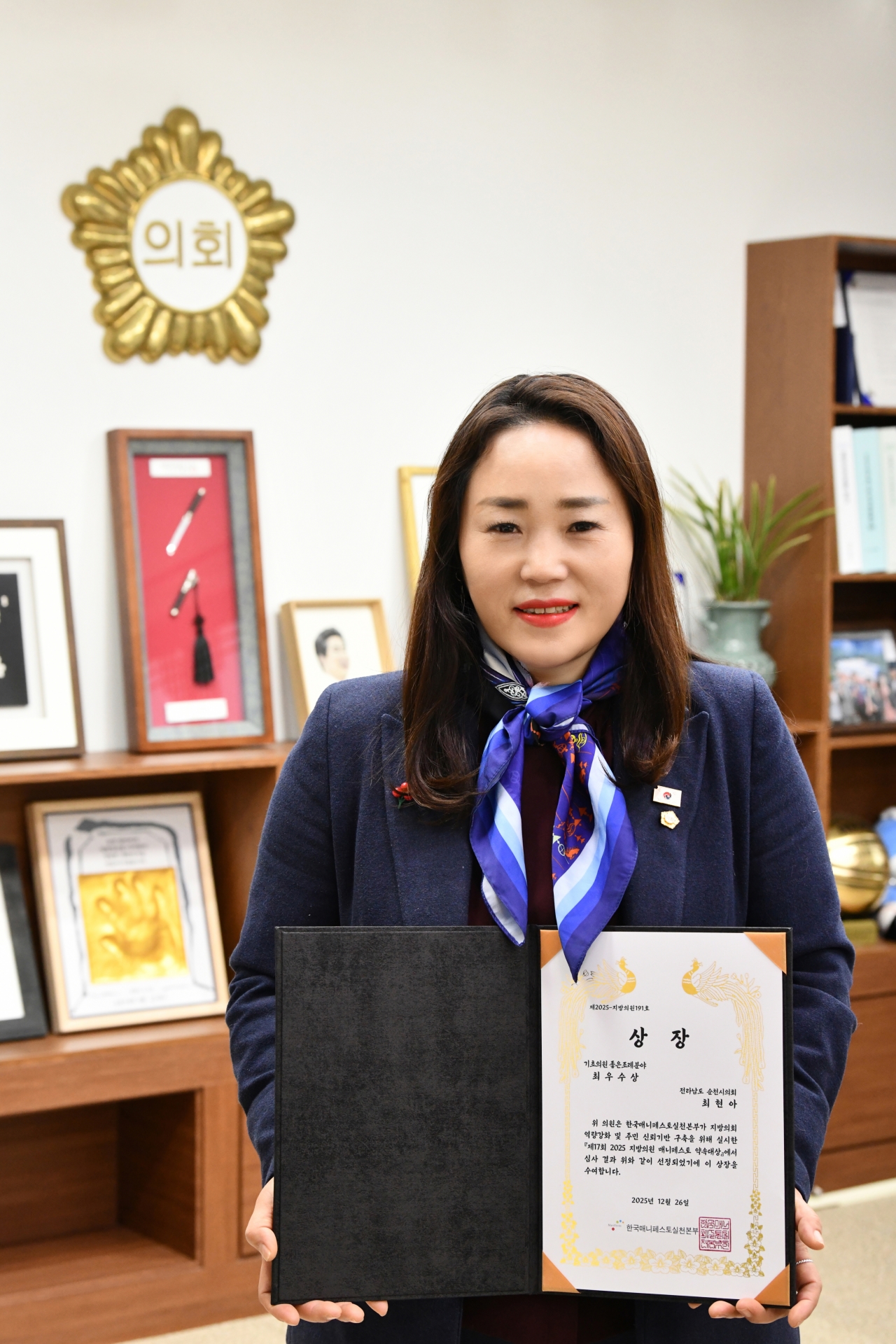[2026년 1월 12일] 전남 순천시의회 최현아 의원(더불어민주/신대지구)이 한국매니페스토실천본부가 주관하는 ‘제17회 2025 지방의원 매니페스토 약속대상’에서 좋은 조례 분야