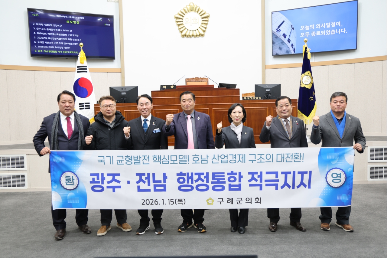 구례군의회(의장 장길선)는 지난 1월 15일, 제326회 임시회 제1차 본회의에서 「광주·전남 행정통합 지지 성명서」를 채택했다고 밝혔다.
