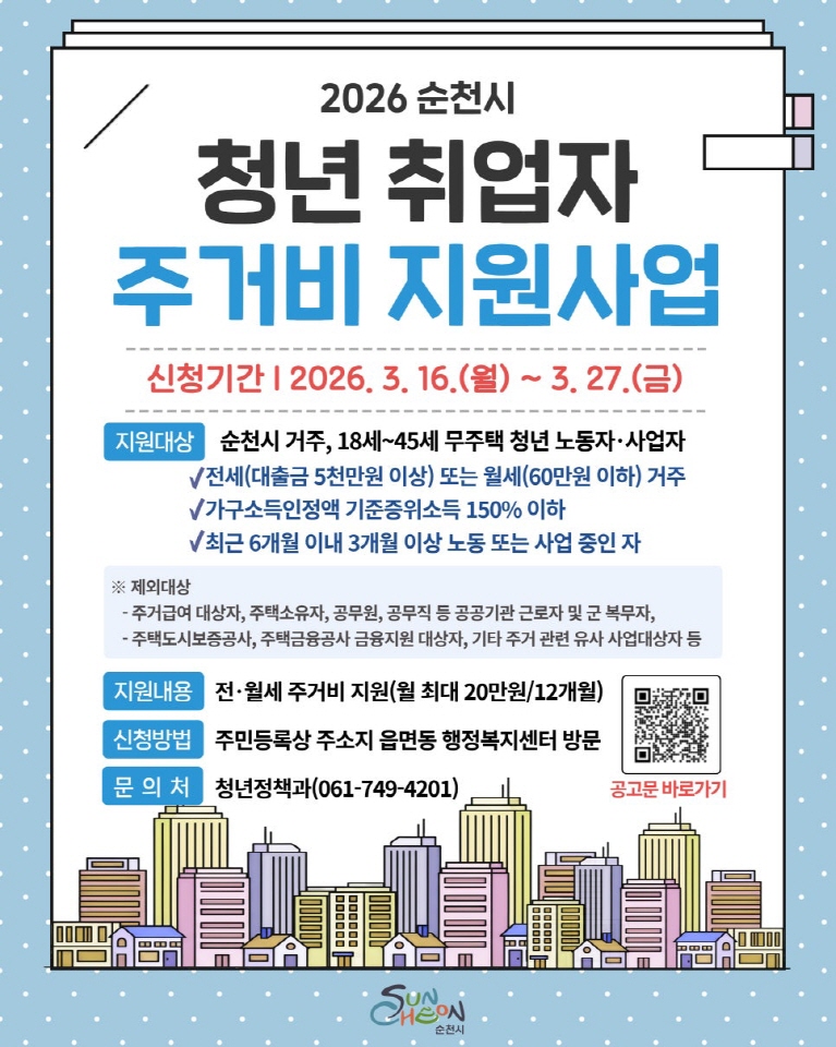순천시는 성실히 일하는 청년의 주거 안정과 경제적 자립 기반 마련을 위해「청년 취업자 주거비 지원사업」 대상자를 오는 27일까지 모집한다.