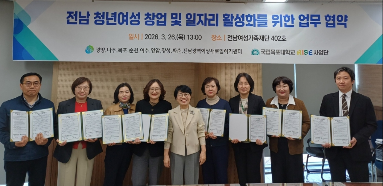❏ 전남여성가족재단 전남광역새일센터는 3월 26일 전남 지역 9개 새일센터와 함께, 국립목포대학교 RISE사업단 창업혁신허브센터와 협약을 체결하고 청년 여성 창업 지원을 위한 협력 체계 구축을 논의했다.