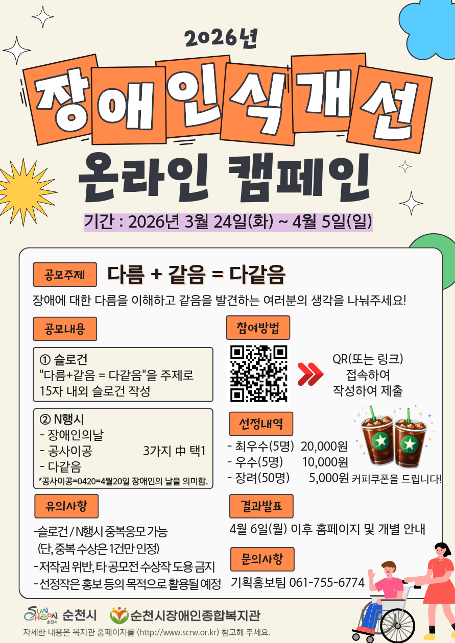 순천시장애인종합복지관은 오는 4월 20일 장애인의 날을 맞아 장애에 대한 인식을 개선하고, 더불어 살아가는 사회에 대한 긍정적인 공감대를 확산하기 위해 2026년 장애인식개선 온라인 캠페인 ‘다름+같음=다같음’을 실시한다.