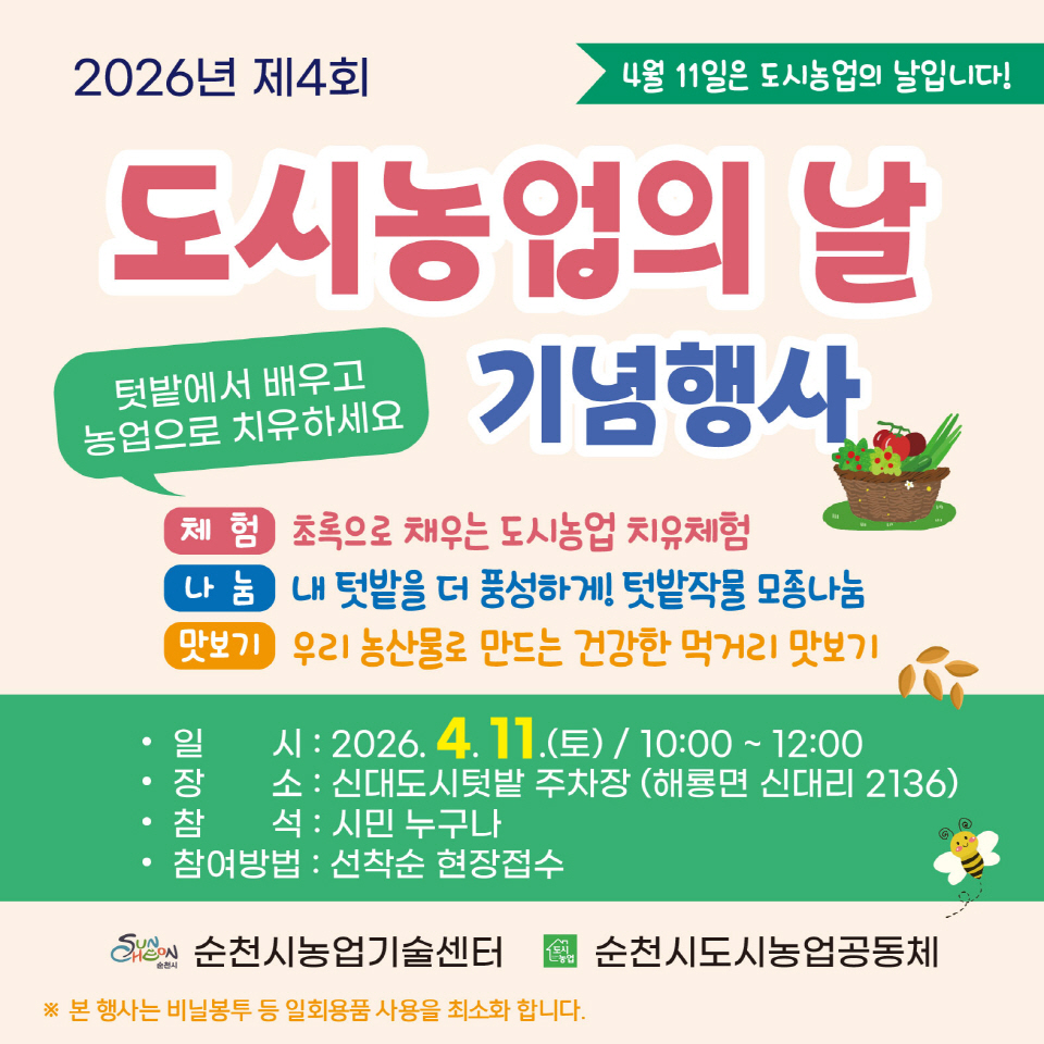 순천시는 오는 4월 11일 오전 10시 신대도시텃밭에서 ‘2026년 제4회 도시농업의 날 기념행사’를 개최한다고 밝혔다.