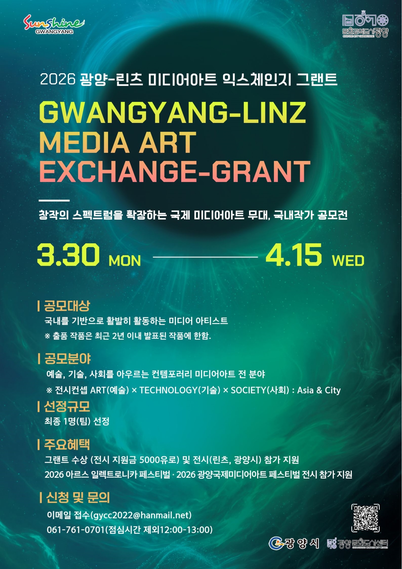 광양문화도시센터는 오스트리아 린츠와의 예술 교류를 확대하고 국내 미디어아트의 국제 경쟁력을 높이기 위해 「광양-린츠 미디어아트 익스체인지 그랜트(Exchange-Grant)」에 참여할 국내 작가를 공개 모집한다.