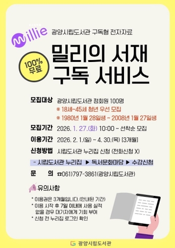 광양중앙도서관, 청년 대상 ‘밀리의 서재’ 구독 서비스 확대 분기별 선착순 100명 모집, 3개월 이용권 제공 광양시 광양중앙도서관이 청년층의 독서 습관 형성과 온라인 독서문화 확산을 위해 전자책 구독 서비스 ‘밀리의 서재’ 참여자를 모집한다. 이번 사업은 ‘미래를 준비하는 소중한 청년(미...