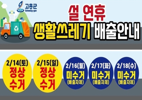 고흥군, 설 연휴 대비 생활폐기물 수거 및 관리대책 마련 2월 14~15일 정상 수거, 2월 16~18일 기동반 운영