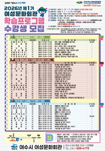 여수시 여성문화회관, 제1기 학습프로그램 수강생 모집 37개 과목 573명… 2월 19일부터 ‘OK통합예약시스템’에서 신청