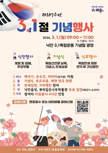 순천시, 시민과 함께하는 제107주년 3.1절 기념행사 개최 3월 1일 10시, 낙안3.1독립운동기념탑 광장에서 만나요 순천시 순천시는 오는 3월 1일(일) 오전 10시, 낙안3.1독립운동기념탑 광장에서 제107주년 3.1절 기념행사를 개최한다고 밝혔다. 이번 행사는 순국선열의 숭고한 나라사랑 정신...