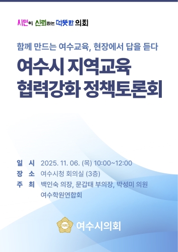 여수시의회, 11월 6일 ‘여수시 지역교육 협력강화 정책토론회’ 개최 여수시의회 여수시의회는 오는 11월 6일 오전 10시, 여수시청 3층 회의실에서 “함께 만드는 여수교육, 현장에서 답을 듣다”를 주제로 ‘여수시 지역교육 협력강화 정책토론회’를 개..... 2025-11-03