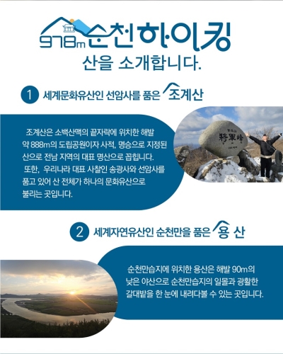 순천시, 생태 명소와 세계유산을 잇는 ‘2025 순천 978m 하이킹’ 운영 순천시 순천시(시장 노관규)는 오는 15일부터 23일까지 총 3회에 걸쳐, 순천의 대표 생태 명소와 세계유산을 잇는 프리미엄 하이킹 프로그램 ‘2025 순천 978m 하이킹’을 운..... 2025-11-10