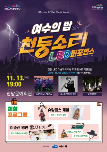 여수시, 이순신 장군 이야기 담은 ‘여수의 밤, 천둥소리’ 2회차 공연 개최 여수시 여수시(시장 정기명)는 오는 13일(목) 진남문예회관에서 ‘여수의 밤, 천둥소리’ 2회차 공연을 진행한다. 이번 공연은 시민과 관광객 누구나 사전 예약 없이 무료로 관람할 ..... 2025-11-11