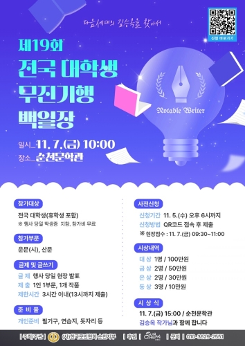 순천문인협회, 제19회 전국대학생 무진기행 백일장 개최 순천시 한국문인협회 순천지부는 오는 7일 순천문학관 일원에서 ‘제19회 전국대학생 무진기행 백일장’을 개최한다고 밝혔다. 이번 백일장은 순천 출신의 소설가 김승옥 작가의 문학정신을..... 2025-11-04