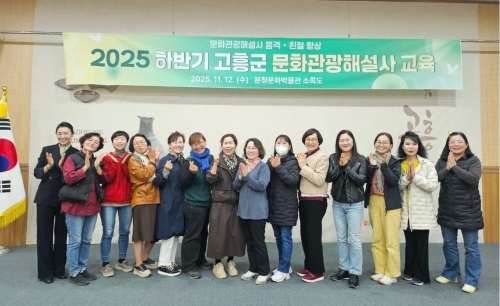 고흥군, 문화관광해설사 친절 역량 강화 자체 교육 실시 고흥군 고흥군(군수 공영민)은 12일 분청문화박물관 강당에서 고흥군 문화관광해설사 하반기 자체 보수교육을 실시했다고 밝혔다. 현재 고흥군에는 총 15명의 문화관광해설사가 활동 중이..... 2025-11-12