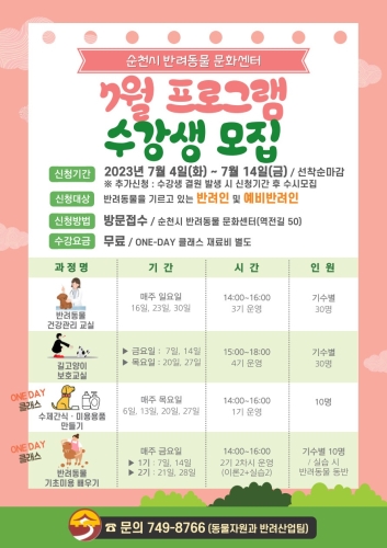 순천시-반려동물 문화센터 7월 프로그램 수강생 모집 안내 홍보물 순천시(시장 노관규)는 지난 6월부터 ‘반려...