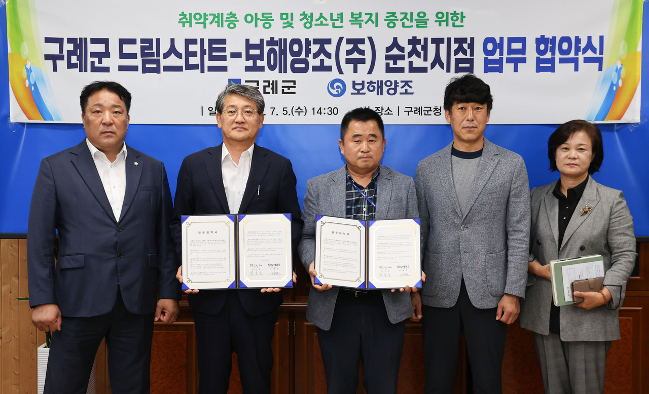 이번 업무 협약은 구례군 드림스타트와 보해양조(주) 순천지점이 드림스타트 이용 아동 및 가정의 복지 증진을 도모하기 위하여 체결됐다. 협약식에는 김순호 구례군수, 노현옥 보해양조(주) 순천지점장, 김수철 구례군의회 부의장, 장형덕 구례라이온스클럽회장 등 주요 관계자가 참석했다.